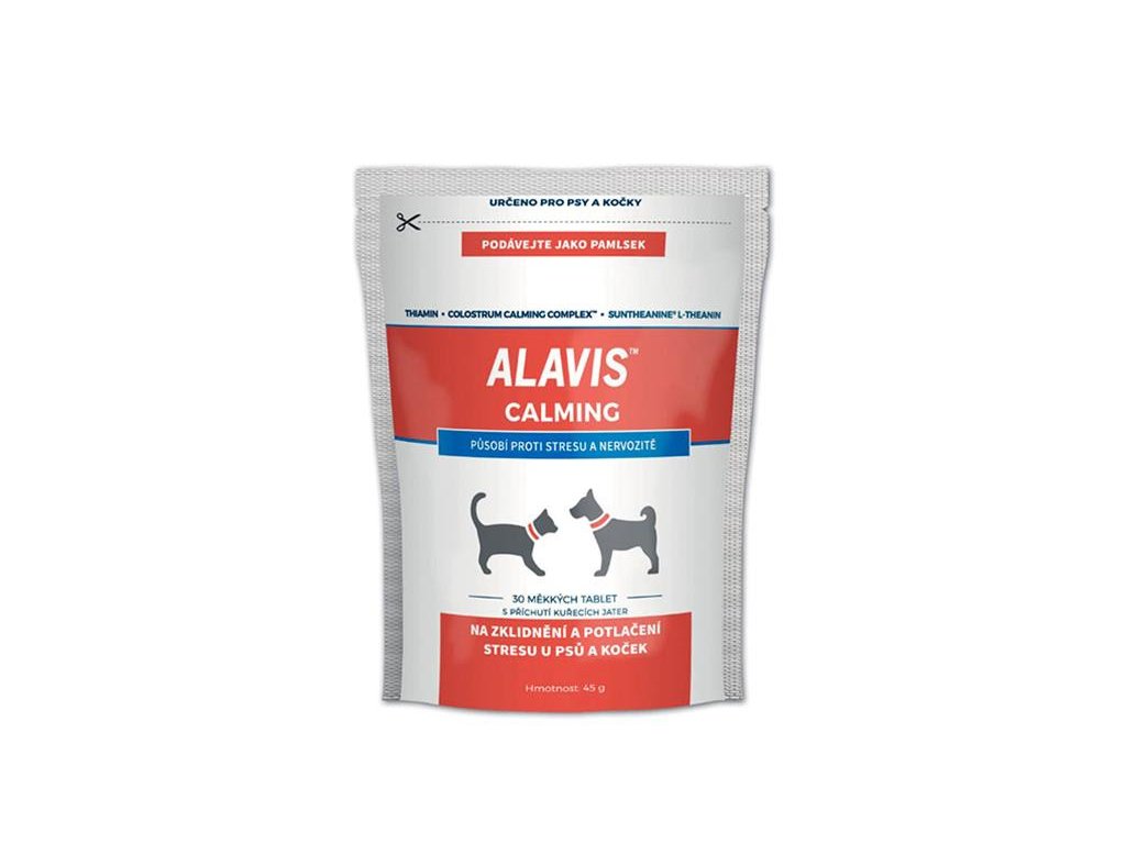 ALAVIS Calming sú mäkké žuvacie tablety vhodné pre psy a mačky všetkých plemien. Pomáhajú upokojiť zvieratá v stresových situáciách, ako sú ohňostroje, búrky, cesty autom, zmeny prostredia, návštevy veterinára alebo pri osamotení a nude.