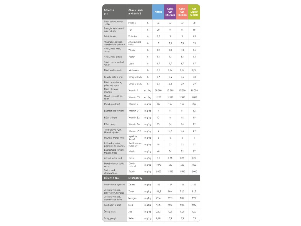 Receptúra krmiva spĺňa všetky nutričné požiadavky dospelých mačiek a vďaka svojej vynikajúcej chutnosti uspokojí aj vyberavé mačacie jedince. Optimálna hladina bielkovín (kuracie mäso) a tukov spolu s ďalšími živinami a vitamínmi zaisťuje výbornú kondíciu a zdravie. FMP systém a juka podporujú správnu funkciu tráviacej sústavy a spolu s betaglukánmi posilňujú imunitný systém. Juka navyše redukuje prirodzený zápach exkrementov a pridaný taurín zabezpečuje mačke vynikajúci zrak.