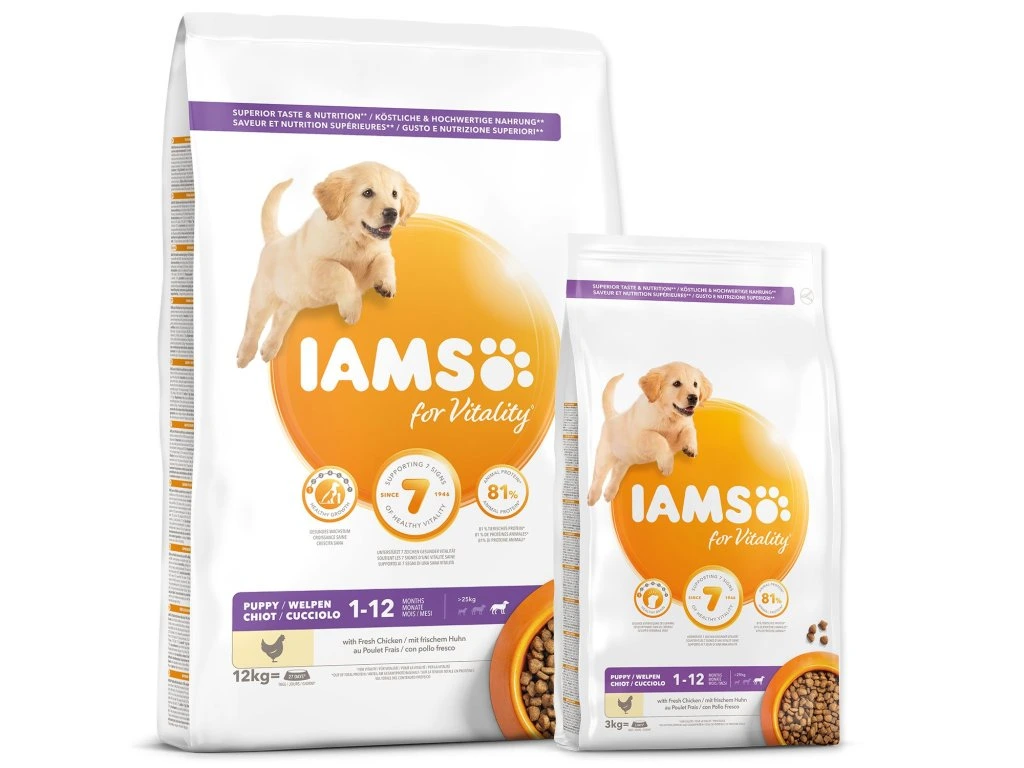 Krmivo IAMS for Vitality pre šteňatá veľkých plemien je 100% kompletné a vyvážené odborníkmi zostavené krmivo, ktoré bude vášmu šteňaťu svedčiť. Naša nová a vylepšená receptúra pre šteňatá s čerstvým kuracím mäsom je založená na kvalitných živočíšnych bielkovinách, ktoré boli starostlivo vybrané, aby podporovali sedem znakov zdravej vitality šteňaťa. Aby boli šteňatá zdravé, aktívne a plné energie, obsahujú naše lahodné receptúry až 81% živočíšnych bielkovín z kuracieho mäsa (z celkového obsahu bielkovín).